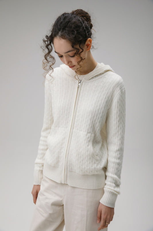 Unisex Cable Zip Cashmere Hoodie - Soft White
