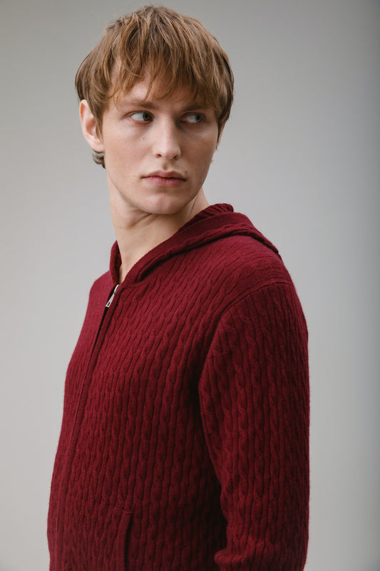 Unisex Cable Zip Cashmere Hoodie - Burgundy