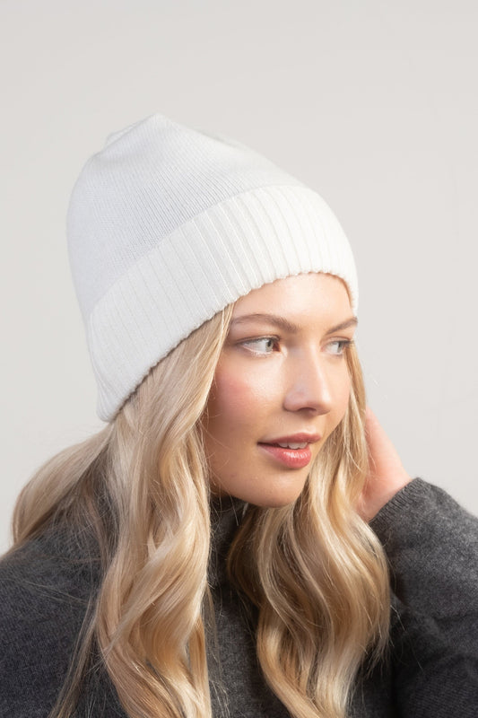 Unisex Cashmere Ribbed Beanie Hat - Soft White
