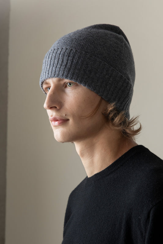 Unisex Cashmere Ribbed Beanie Hat - Steel