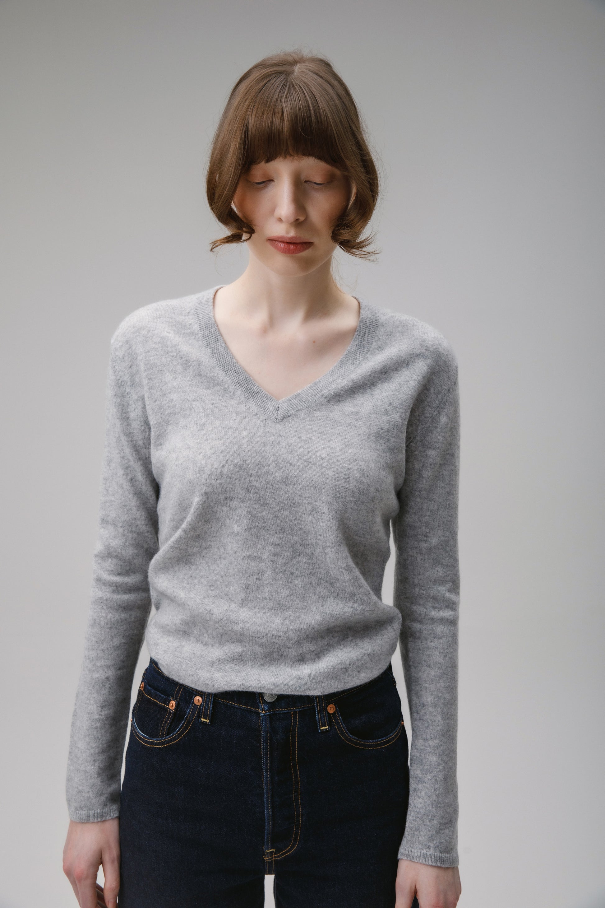 Our Women's V Neck Grey Cashmere Jumper is supersoft and lightweight. Made from 100% cashmere with a ribbed neckline, cuff and hem. Designed as a luxurious layer or a stand-alone piece.