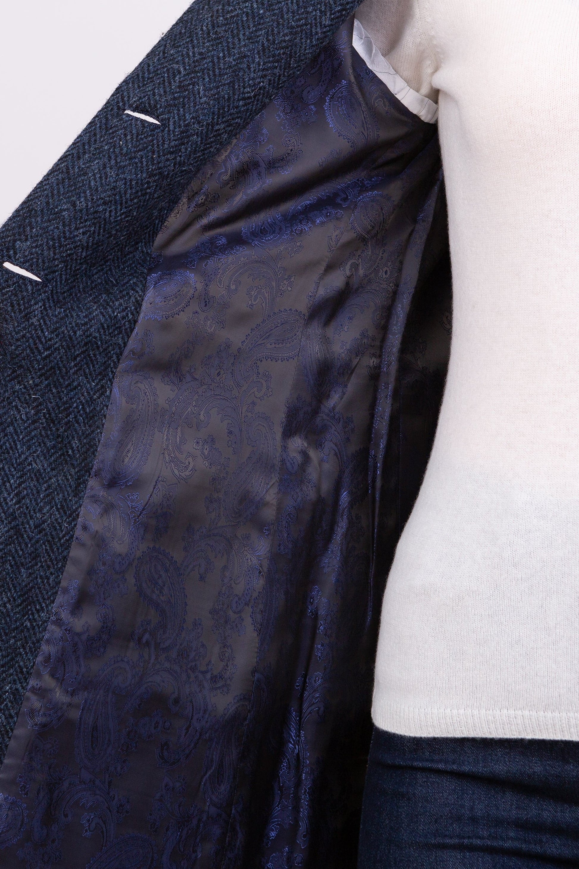 Fitted style coat made from iconic Harris Tweed in the Outer Hebrides in Dark Navy Blue Herringbone. Three button fastening with two pockets, a single vent at the back and finished with feature lining for a classic look.